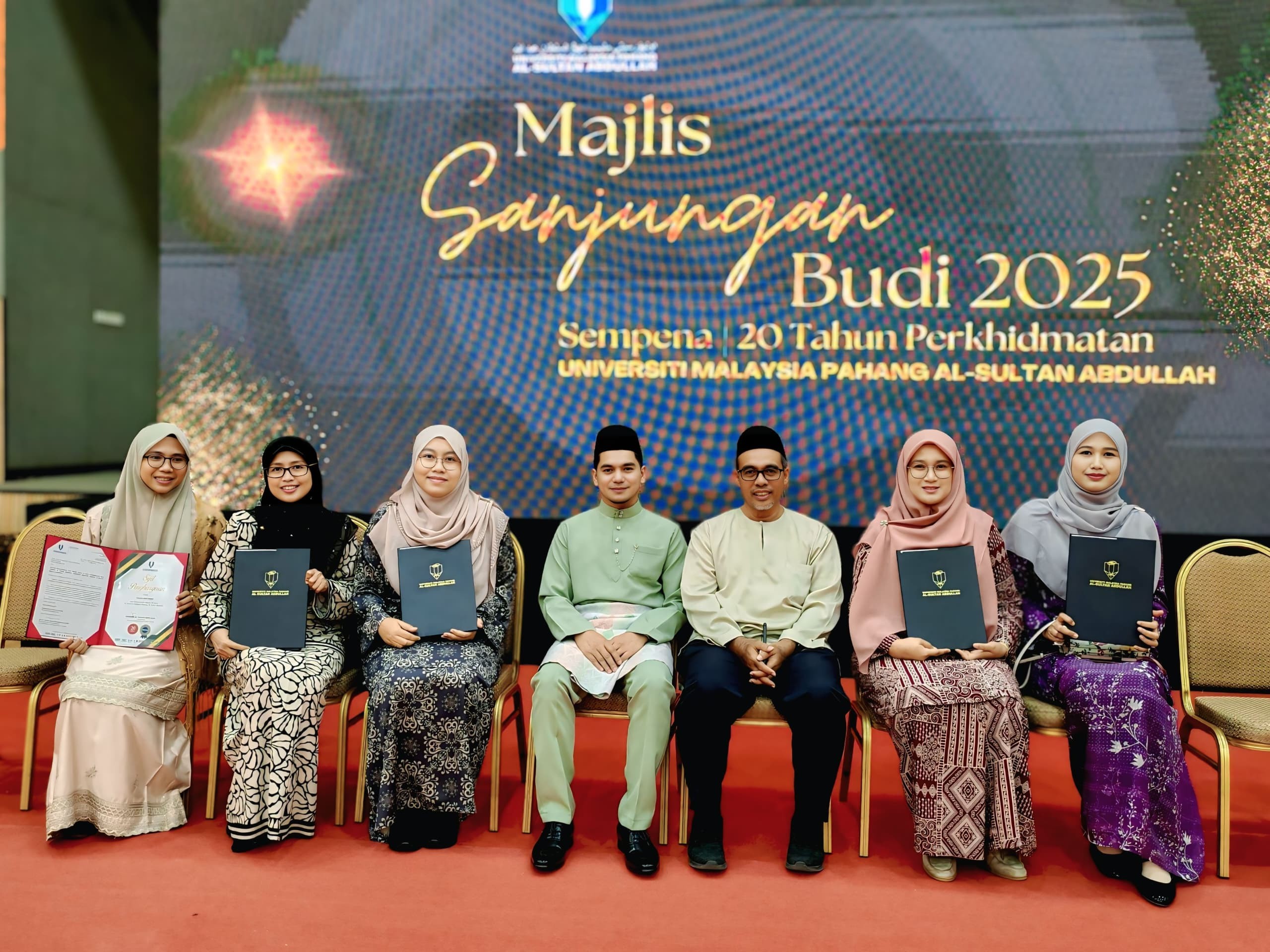 On April 14, 2025, five PSM staff who have served the university for 20 years were honoured at the Majlis Sanjungan Budi 2025, held in conjunction with the Majlis Amanat Naib Canselor at the Dewan Serbaguna, UMPSA Pekan Campus. Congratulations and heartfelt thanks go to Assoc. Prof. Dr Yuhani Yusof, Dr Najihah Mohamed, Dr Nor Alisa Mohd Damanhuri, Ts. Dr Norazaliza Mohd Jamil, and Dr Siti Zanariah Satari for their dedication to UMPSA over the years.